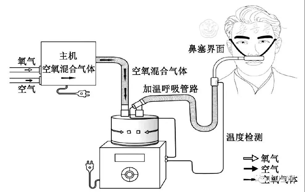 HFNC是指一種通過高流量鼻塞持續(xù)為患者提供可以調(diào)控并相對恒定吸氧濃度(21%~100%)、溫度(31~37 ℃)和濕度的高流量(8~80 L/min)吸入氣體的治療方式。該治療設備主要包括空氧混合裝置、濕化治療儀、高流量鼻塞以及連接呼吸管路[3]。結(jié)合國內(nèi)和國際通用命名習慣,本共識統(tǒng)一采用"經(jīng)鼻高流量濕化氧療"進行表述,英文簡稱為HFNC(圖1)。