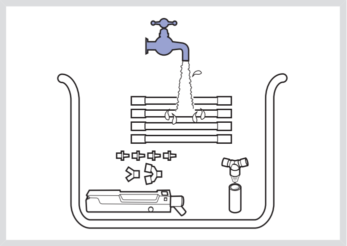 - 在水中徹底漂洗各部件以除去所有殘留的消毒劑。讓水從各部件中流過(guò)。