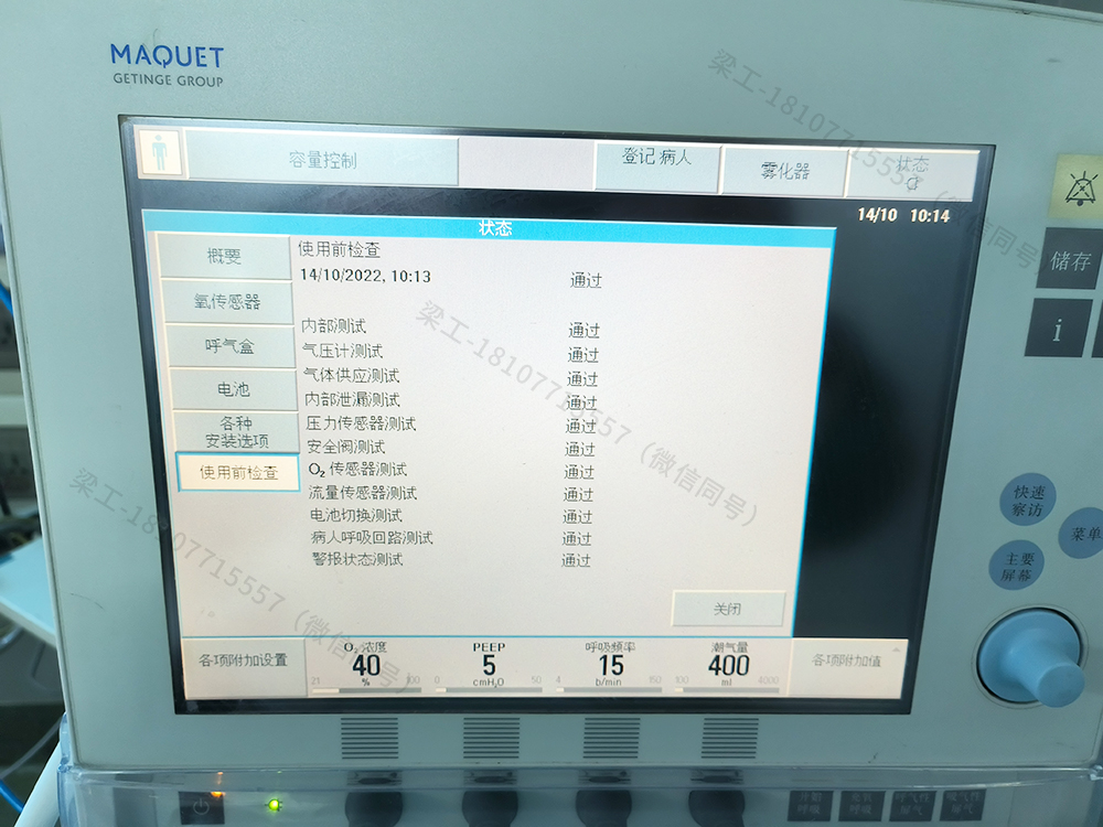 1、使用前檢查 呼吸機(jī)和患者連接前應(yīng)始終執(zhí)行一次使用前檢查,該項(xiàng)檢查可以說(shuō)是呼吸機(jī)的一項(xiàng)全身檢查,一共 11 個(gè)測(cè)試項(xiàng)目。 包括:(內(nèi)部測(cè)試,氣壓計(jì)測(cè)試,氣體供應(yīng)測(cè)試,內(nèi)部泄漏測(cè)試,壓力傳感器測(cè)試,安全閥測(cè)試,氧氣傳感器測(cè)試,流量傳感器測(cè)試,電池切換測(cè)試,患者呼吸回路測(cè)試,報(bào)警狀態(tài)測(cè)試)。 通過(guò)這些測(cè)試能更快地排除機(jī)器的故障。 注意:測(cè)試時(shí)僅能使用邁柯唯的藍(lán)色測(cè)試管。 2、機(jī)器外觀保養(yǎng) 觀察呼吸機(jī)的外觀是否有損壞,檢查電源和控制電纜的連接是否損壞,可以用干凈的軟布清潔呼吸機(jī)的外表面,每日或隔日1次都可以,必要時(shí)可以用乙二醇(70%)或異丙醇(70%)去污,清潔時(shí)應(yīng)注意清潔液流入機(jī)器內(nèi)造成故障。 3、用戶界面檢查 打開(kāi)機(jī)器,進(jìn)入維修界面進(jìn)行測(cè)試,包括觸摸屏的可讀性、亮度、透明度及表面,觸摸屏的功能,主旋轉(zhuǎn)鈕,直接控制按鈕,薄膜按鈕,該項(xiàng)測(cè)試按照提示操作即可完成。 4、氧電池的維護(hù) 正常情況下,氧電池的工作時(shí)間約為5000h,每年至少做一次預(yù)防性維護(hù)。 執(zhí)行使用前檢查,可以檢測(cè)氧電池的狀況,也可以通過(guò)菜單選項(xiàng)查看氧電池的狀態(tài)。 氧電池剩余電量<10%,就應(yīng)更換氧電池,更換時(shí)應(yīng)確保新橡膠密封墊完好無(wú)損,然后用力將新濾菌器放入其內(nèi)。 5、內(nèi)置電池檢查 通過(guò)“電池狀態(tài)窗口”可查看詳細(xì)的電池狀態(tài)信息。 當(dāng)從電池供電操作時(shí),電池剩余時(shí)間顯示為紅色時(shí),表示電池模塊剩下非常少的操作時(shí)間,并且必須更換電池模塊。 當(dāng)呼吸機(jī)處于不用狀態(tài)時(shí),應(yīng)將呼吸機(jī)與電源連接,以確保電池充滿電。 為保證可靠的電池后背供電,應(yīng)始終安裝兩個(gè)完全充滿電的電池模塊。 注意:后背蓄電池模塊必須每30個(gè)月更換一次。 6、呼氣盒的維護(hù)保養(yǎng) 關(guān)機(jī)狀態(tài)下,取出呼氣盒,用蒸餾水沖洗,水必須能自由地流經(jīng)呼氣盒,水流流速<10L/min,可以用70%的乙二醇或異丙醇浸泡大約30min后用蒸餾水沖洗呼氣盒,在水中沖洗去除殘留的消毒劑,水必須從各部件自由地流過(guò),水流流速<10L/min,在室溫下自然干燥24~48h,換了新的呼出氣體模塊后,一定要通過(guò)自檢方能使用。 7、主機(jī)過(guò)濾網(wǎng) 一般采用常規(guī)保養(yǎng),具體方法是取出過(guò)濾網(wǎng),用清水沖洗表面表面灰塵,自然晾干后裝回或者用吸塵器清理灰塵,然后裝回原位。 清洗頻率:一般每1、2周清洗一次。 8、保養(yǎng)套件的更換 每年或每5000h應(yīng)更換兩個(gè)氣體模塊過(guò)濾器、吸氣壓力傳感器 過(guò)濾器、氧傳感器細(xì)菌過(guò)濾器和兩個(gè)氣體模塊的噴嘴。 定期更換保養(yǎng)套件能有效避免一些故障的發(fā)生。