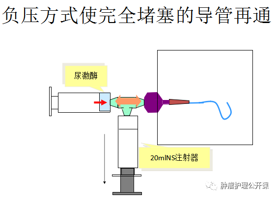 2、根據(jù)堵管液體的性質(zhì)(的 沉積、脂肪乳劑、酸性、堿性等)選擇尿激酶、乙醇、 碳酸氫鉀、弱鹽酸等通管,不可強行沖管