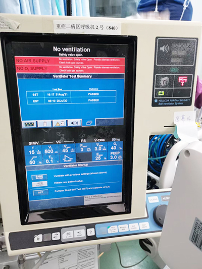 故障現(xiàn)象: 呼吸機(jī)報(bào)警:氧氣濃度過(guò)低,其他正常。 故障分析: PB840呼吸機(jī)氧濃度過(guò)低報(bào)警一般原因有:墻面供氧壓力不足;氧電池失效造成氧濃度檢測(cè)不準(zhǔn)確;氧氣流量傳感器出現(xiàn)故障。分析原因后進(jìn)行故障排查和檢修。 解決方法: 第一步校準(zhǔn)氧氣流量傳感器,結(jié)果通過(guò),但出現(xiàn)錯(cuò)誤提示; 第二步檢查中心供氧進(jìn)入病區(qū)的氧氣壓力,壓力表顯示氧氣壓力正常,排除氧氣壓力故障; 第三步測(cè)量氧氣傳感器連接線(xiàn),接線(xiàn)正常且外觀正常,則考慮是否是氧電池有問(wèn)題。 監(jiān)測(cè)氧濃度的氧電池位于呼吸輸送系統(tǒng)的呼入管道內(nèi),氧電池用于監(jiān)測(cè)混合氣體的氧濃度。PB840呼吸機(jī)氧電池使用壽命為一年左右。 排除上述原因后,確定是氧電池的故障。 更換氧電池后開(kāi)機(jī),進(jìn)行EST自檢,檢測(cè)通過(guò),再次使用,檢查氧濃度設(shè)定值與所監(jiān)測(cè)到的供氣氧濃度相吻合,且線(xiàn)性變化良好,一切正常,故障解除。 二、無(wú)法連接設(shè)置病人 故障現(xiàn)象: 呼吸機(jī)開(kāi)機(jī)后顯示無(wú)法連接設(shè)置病人,呼吸機(jī)錯(cuò)誤,且有聲光報(bào)警。 故障分析: 重新開(kāi)機(jī),報(bào)警依舊,由于呼吸閥測(cè)試屬于擴(kuò)展式自檢,所以進(jìn)行擴(kuò)展式自檢,結(jié)果失敗,提示有兩個(gè)錯(cuò)誤,再次測(cè)試,結(jié)果未變,查看維修手冊(cè),錯(cuò)誤提示為流量傳感器故障。 解決方法: 先拆開(kāi)設(shè)備查看呼吸模塊其他元件,發(fā)現(xiàn)在呼氣閥的密封墊上有很多雜物,判斷這些雜物破壞呼氣閥的密封性,導(dǎo)致流量監(jiān)測(cè)偏離實(shí)際值。 用醫(yī)用消毒酒精清潔,裝好后再次測(cè)試,結(jié)果通過(guò),故障解除。 排除了流量傳感器的故障,節(jié)約了成本。 三、嚴(yán)重阻塞報(bào)警 故障現(xiàn)象: PB840呼吸機(jī)在運(yùn)行過(guò)程出現(xiàn)嚴(yán)重阻塞報(bào)警。 故障分析: PB840呼吸機(jī)在運(yùn)行過(guò)程中出現(xiàn)阻塞報(bào)警,通常是由兩種情況導(dǎo)致,可能是管道出現(xiàn)積水或折疊,,也可能是吸入端或呼出端發(fā)生過(guò)濾器堵塞。 一、此種情況下,報(bào)警會(huì)出有兩種顯示:即Severe ocelusion和Screen blocked。 ① 如果呼吸機(jī)顯示Severe ocelusion,就表明呼吸機(jī)管道出現(xiàn)了阻塞,清理管道異物或更換管路就可解決。 ② 如果呼吸機(jī)顯示Screen blocked,,就提示呼吸機(jī)觸摸屏感應(yīng)出現(xiàn)了故障。 二、觸摸屏感應(yīng)故障分為3種情況:局部失靈、反應(yīng)遲鈍和根本無(wú)反應(yīng)。 ① 局部失靈一般由紅外發(fā)射或接收損壞導(dǎo)致; ② 反應(yīng)遲鈍一般是屏幕外框集聚了過(guò)多灰塵,阻斷了紅外發(fā)射和接收,也有可能是內(nèi)部灰塵多; ③ 根本無(wú)反應(yīng)則是因內(nèi)部觸摸框板固定不佳,出現(xiàn)偏位,重新固定或調(diào)整能解決。 ④ 如是根本不靈敏,可能是觸摸框板損壞或顯示屏主板壞。 解決方法: 先對(duì)外部管路進(jìn)行檢查,包括呼出過(guò)濾器、吸入過(guò)濾器、積水杯等,并檢查呼吸管道是否有積水、分泌物過(guò)多或折疊,如果均正常的話(huà),就運(yùn)行快速自檢。在自檢過(guò)程中,如果流量傳感器不能通過(guò)測(cè)試,且出現(xiàn)錯(cuò)誤代碼FS0001和FS0003,就說(shuō)明呼出端過(guò)濾器出現(xiàn)故障。 呼出過(guò)濾器內(nèi)部的過(guò)濾紙應(yīng)保持干燥,如果發(fā)現(xiàn)進(jìn)水痕跡,則用高溫高壓消毒烘干,或者進(jìn)行更換,呼吸機(jī)就可正常運(yùn)行。 注意事項(xiàng): 呼出過(guò)濾器拆裝過(guò)程中,必須要確保過(guò)濾器內(nèi)的過(guò)濾紙干燥,也不能將其倒放,防止積水杯的液體倒流,使過(guò)濾紙進(jìn)水受損。 在消毒呼氣過(guò)濾器的時(shí)候,應(yīng)對(duì)其密封圈同步消毒,消毒完成后,將密封圈固定好,避免出現(xiàn)漏氣問(wèn)題。 四、潮氣量偏低 故障現(xiàn)象: 患者參數(shù)設(shè)置中潮氣量為500ml,實(shí)際潮氣量偏低。 故障分析: 如果呼吸機(jī)提示患者潮氣量嚴(yán)重偏低,將呼吸機(jī)潮氣量設(shè)定為450mL,則顯示呼出潮氣量為340mL左右。若患者狀態(tài)正常,出現(xiàn)這種問(wèn)題的主要原因有三種:一是患者回路漏氣;二是主動(dòng)呼出閥臟;三是流量傳感器故障。 解決方法: 若系統(tǒng)診斷日志未出現(xiàn)報(bào)錯(cuò)提示,就運(yùn)行SST檢查呼吸回路是否正常。 如流量傳感器通不過(guò)檢查,可暫時(shí)忽略,繼續(xù)進(jìn)行檢查,直到排除呼吸回路漏氣問(wèn)題。排除漏氣問(wèn)題后,再運(yùn)行EST,觀察漏氣測(cè)試能否通過(guò)測(cè)試,如出現(xiàn)測(cè)試錯(cuò)誤,則檢查和清洗呼出閥。 清洗時(shí),應(yīng)卸下密封圈,使用乙醇進(jìn)行清洗,可解決故障。 再次運(yùn)行EST進(jìn)行復(fù)試,如果系統(tǒng)仍然提示流量傳感器測(cè)試通不過(guò),就需要觀察上半屏流量傳感器數(shù)據(jù)。 如果在測(cè)試過(guò)程中,氧流量傳感器為120L/min時(shí),呼出流量傳感器為100L/min,當(dāng)空氣流量傳感器為120L/min時(shí),呼出流量傳感器仍為100L/min,就可以判定呼出端流量傳感器出現(xiàn)故障,只要將故障流量傳感器更換即可。 五、GUI顯示屏上半屏