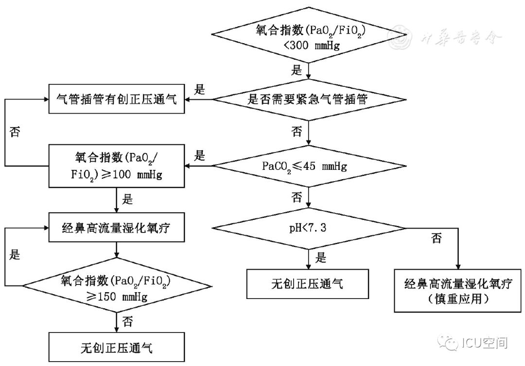 圖1 經(jīng)鼻高流量濕化氧療儀示意圖 人類開(kāi)始氧氣治療的歷史可回溯到18世紀(jì)后葉,20世紀(jì)初即開(kāi)始應(yīng)用橡膠制作的鼻導(dǎo)管進(jìn)行氧療[4]。1987年美國(guó)研發(fā)了最高流量可達(dá)20 L/min的氧療加溫濕化裝置MT-1000,應(yīng)用于囊性肺纖維化等患者氧療促進(jìn)下呼吸道分泌物排出。近10年來(lái),HFNC進(jìn)入快速發(fā)展和臨床廣泛應(yīng)用階段,國(guó)際主流HFNC裝置都是采用無(wú)創(chuàng)呼吸機(jī)的工作原理:用空氧混合器進(jìn)行空氧混合,吸入氧濃度(FiO2)為21%~100%,應(yīng)用渦輪提供高流量的氣體,采用呼吸機(jī)應(yīng)用的加溫加濕器和管路加熱導(dǎo)絲對(duì)吸入氣體進(jìn)行全程加溫加濕,并通過(guò)近患者端實(shí)時(shí)監(jiān)測(cè)溫度和氧濃度進(jìn)行動(dòng)態(tài)調(diào)控。另外,部分呼吸機(jī)廠家在有創(chuàng)和無(wú)創(chuàng)呼吸機(jī)上設(shè)置了HFNC功能,進(jìn)一步拓展了呼吸機(jī)的臨床適用范圍,這也是未來(lái)的發(fā)展方向[5]。國(guó)內(nèi)HFNC的歷史僅有5年左右,在前期仿制國(guó)外HFNC的基礎(chǔ)上進(jìn)行創(chuàng)新,在很短的時(shí)間內(nèi)形成自己的特色,如可自動(dòng)調(diào)節(jié)和精確調(diào)控FiO2(21%~100%)、溫度控制精度可達(dá)到±1 ℃、呼吸管路采用免消毒氣路技術(shù)等。 二、HFNC設(shè)備的結(jié)構(gòu)特點(diǎn)及其工作原理 (一)HFNC的結(jié)構(gòu)特點(diǎn) HFNC按其結(jié)構(gòu)特點(diǎn)可分為3大組成部分。 (1)氣體的空氧混合部分:其作用是將空氣和氧氣按預(yù)設(shè)氧濃度在渦輪前進(jìn)行混合。氧濃度調(diào)控有2種方法,一種是通過(guò)浮標(biāo)式氧氣流量計(jì)調(diào)節(jié)氧氣流量實(shí)現(xiàn)對(duì)氧濃度的控制,該方法無(wú)法預(yù)設(shè)氧濃度,只能通過(guò)調(diào)節(jié)氧氣流量產(chǎn)生實(shí)際的FiO2;一種是微型比例閥和超聲氧濃度傳感器實(shí)現(xiàn)對(duì)氧濃度的控制,可以預(yù)設(shè)FiO2。 (2)氣體的加溫濕化部分:其作用是將空氧混合后的氣體進(jìn)行加溫濕化。 (3)氣體的輸送部分:其作用是保證已完成加溫濕化的空氧混合氣體以恒溫恒濕恒流速的方式輸送至患者端。高流量濕化氧療儀與患者連接部分為高流量鼻塞,高流量鼻塞的尖端呈斜面型的出口,質(zhì)地柔軟,用一個(gè)具有彈性可調(diào)節(jié)的過(guò)耳頭帶固定于患者面部。 (二)HFNC的生理學(xué)機(jī)制 HFNC通過(guò)輸送高流速氣體的方式,可以維持一定水平的PEEP,維持肺泡開(kāi)放,有利于呼氣末肺泡復(fù)張和氣血交換。Corley等[6]通過(guò)使用電阻抗斷層掃描(EIT)測(cè)量心臟手術(shù)后肺容積的生理學(xué)研究證明了HFNC可促進(jìn)呼氣末肺容積增加,表明HFNC通過(guò)高流量產(chǎn)生的PEEP作用促進(jìn)肺復(fù)張。有研究結(jié)果顯示,HFNC流量每增加10 L/min,患者咽腔PEEP就增加0.5~1 cmH2O(1 cmH2O=0.098 kPa)[7]。流量增加到60 L/min時(shí),閉口的女性受試者咽腔PEEP可達(dá)到8.7 cmH2O左右,男性為5.4 cmH2O;張口呼吸情況下女性為3.1 cmH2O,男性為2.6 cmH2O左右。但值得注意的是,由于HFNC允許大量漏氣,患者若張口呼吸必然導(dǎo)致PEEP水平不穩(wěn)定[6]。 HFNC通過(guò)為患者提供恒定的、可調(diào)節(jié)的高流速空氧混合氣體,沖刷患者呼氣末殘留在鼻腔、口腔及咽部的解剖無(wú)效腔的氣體,可明顯減少患者下一次吸氣時(shí)吸入的CO2的含量[8]。M?ller等[9]通過(guò)81 mKr氣體測(cè)定HFNC對(duì)10名健康人鼻咽部和3例氣管切開(kāi)患者CO2的清除率,發(fā)現(xiàn)CO2清除率和HFNC的氣體流速和佩戴時(shí)間直接相關(guān)。 HFNC主要關(guān)注于提供相對(duì)精確的恒溫和恒濕的高流量氧療,因而能夠更符合人體生理情況下呼吸道的氣體溫度及濕度,降低醫(yī)用干冷氣體對(duì)上下呼吸道黏液纖毛系統(tǒng)功能和黏膜的影響[10]。與普通氧療相比,使用HFNC可以明顯降低患者鼻、口、咽喉的干燥評(píng)分,有助于稀釋痰液和排痰,修復(fù)和維持人呼吸道上皮細(xì)胞和纖毛的結(jié)構(gòu)和功能,提高患者的舒適度,降低下呼吸道感染的發(fā)生幾率[6,11] 鼻咽腔通過(guò)提供較大的表面積對(duì)吸入氣體進(jìn)行濕化和溫化,但同時(shí)吸入氣體之間的摩擦?xí)?duì)氣流產(chǎn)生明顯的阻力[12]。HFNC可以提供滿足患者吸氣流速需求、恒溫恒濕的高流量氣體,患者在吸氣時(shí)不需要用力吸氣也不需要對(duì)吸入氣體進(jìn)行加溫加濕,這樣不僅降低吸氣阻力,同時(shí)避免患者對(duì)吸入氣體進(jìn)行溫化濕化所需的代謝消耗,減少患者的呼吸做功[13,14]。而且與常規(guī)氧療輸出的低流量氧氣方式相比,HFNC能提供符合或超過(guò)患者所需的吸氣峰流速,減少了吸氣時(shí)空氣的稀釋作用,使得吸入氧氣的濃度不會(huì)受到患者的呼吸頻率、吸氣流速、呼吸形態(tài)等因素的影響,為患者提供精確穩(wěn)定的吸氧濃度,有利于改善患者氧合[6]?;颊叩脱鯛顟B(tài)得到改善,呼吸更舒適,自主用力呼吸減弱,加之PEEP作用,呼吸功會(huì)隨之降低[15]。 三、HFNC與NPPV的異同點(diǎn) HFNC和NPPV在治療原理上存在許多相似之處。從工作原理上看,都是電動(dòng)渦輪機(jī)驅(qū)動(dòng)形成高速氣流,通過(guò)電磁閥實(shí)現(xiàn)流量可控,氣流均可加溫加濕,都是傳統(tǒng)意義上的正